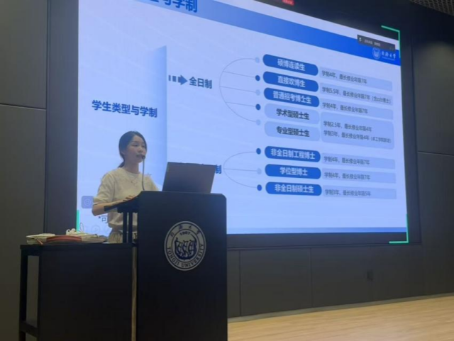 首先,曹雅雯老师为新生介绍了研究生培养类型及学制,明确了不同类别对应的学制要求,并详细梳理了从学校到学院的学生管理组织架构,同时介绍了学院各部门的教务老师,帮助同学们对各职能部门形成清晰的认识。